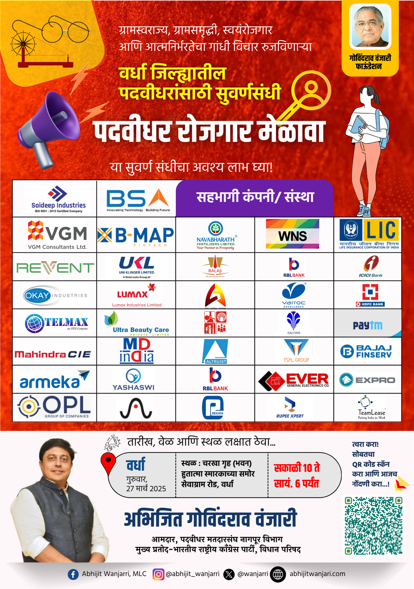 वर्धा(wardha) : राष्ट्रपिता महात्मा गांधी यांच्या पदस्पर्शाने पावन झालेल्या वर्धा जिल्ह्यातील पदवीधर बेरोजगारांसाठी गोविंदराव वंजारी फाऊंडेशनच्या वतीने 27 मार्चला सकाळी 10 ते 6 या वेळेत येथील हुतात्मा स्मारकासमोरील चरखा गृह (भवन) येथे भव्य रोजगार मेळाव्याचे आयोजन करण्यात आले आहे.